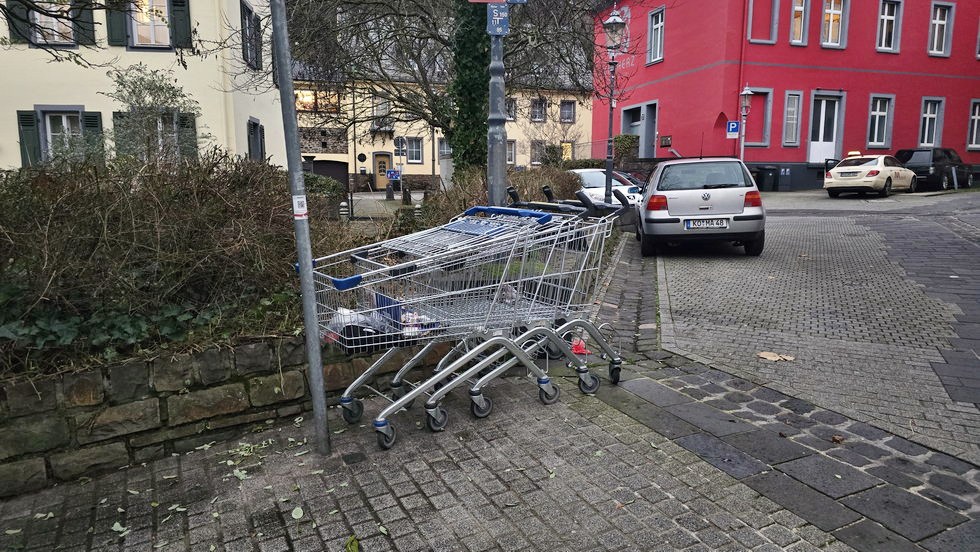 Auch da, wo du es nicht vermutest, tauchen diese doch nicht sehr billigen Einkaufswagen auf. Sie stehen am Rheinufer, in der Helfensteinstraße, wo Menschen gehen und schieben können bleiben sie stehen. Und die Schieber und Schieberinnen verspüren keinerlei Unrechtsbewußtsein. Eine Dählerin schilderte mir, wie sie eine Frau angesprochen hat und darauf hinwies, dass der Wagen zurückzubringen sei. Verständnisloses Kopfschütteln. Ich habe eine Frau getroffen, wohnhaft im Haus Nr 227, die einen Wagen vor der Haustür entlud. Als ich 1 Stunde später wieder zurück kam, stand der Wagen immer noch dort. Ich habe einen Zettel an die Haustür geklebt: „Bitte den Einkaufswagen zurück bringen“. Später war der Zettel weg, der Wagen stand um die Ecke.